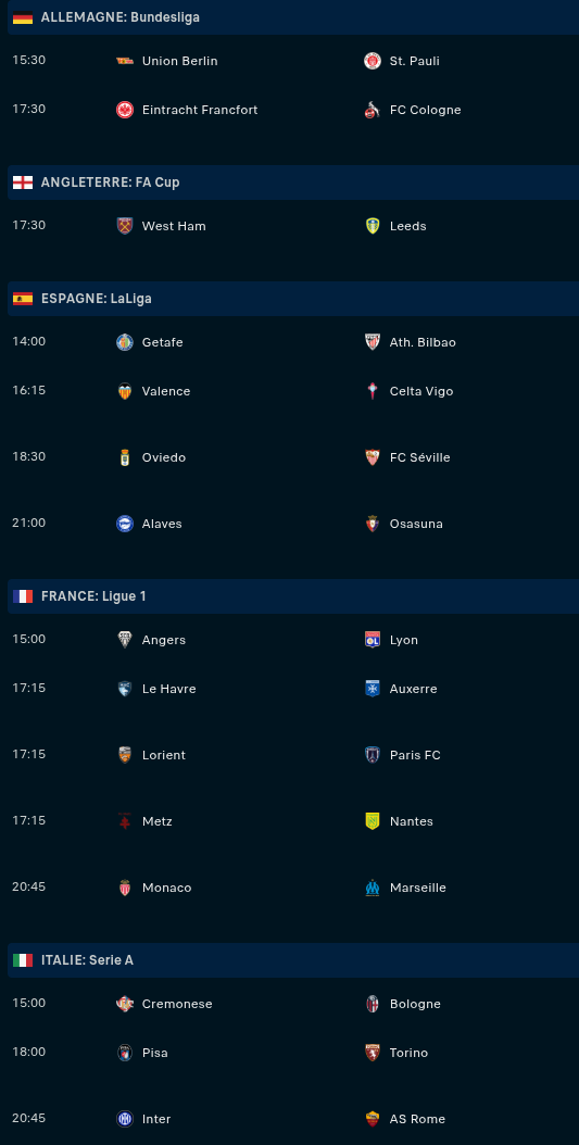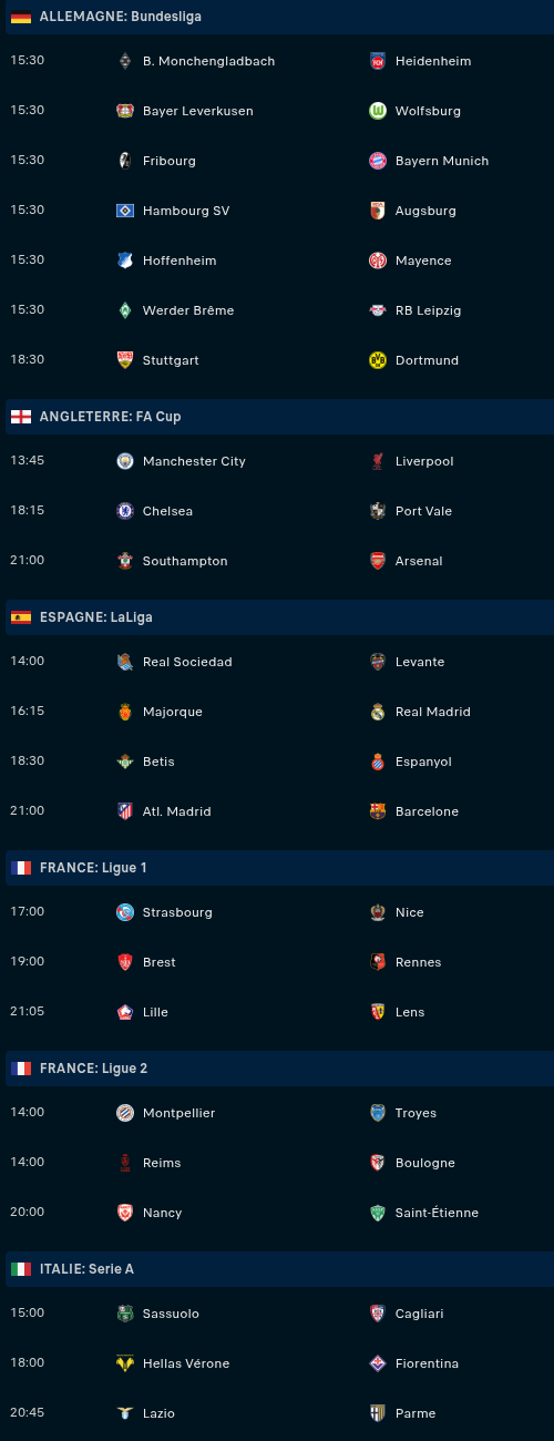 Samedi : Man City - Liverpool (13h45) / Fribourg - Bayern (15h30) / Strasbourg - Nice (17h) / Brest - Rennes (19h) / At. Madrid - Barça (21h) / Southampton - Arsenal (21h) / Lille - Lens (21h05)