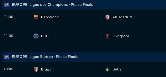 Mercredi : 18h45 ⋅ Braga - Betis || 21h ⋅ PSG - Liverpool / Barça - At. Madrid