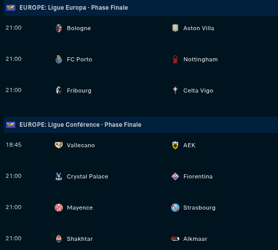 Jeudi : 18h45 ⋅ Vallecano - AEK || 21h ⋅ Mayence - Strasbourg / Porto - Nottingham / Bologne - A. Villa / C. Palace - Fiorentina / Fribourg - Celta / Shakhtar - Alkmaar