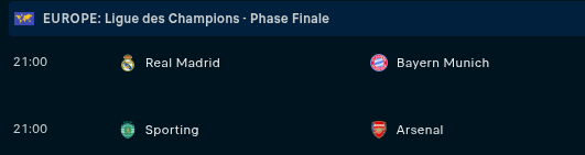 Mardi : 21h ⋅ R. Madrid - Bayern / Sporting - Arsenal