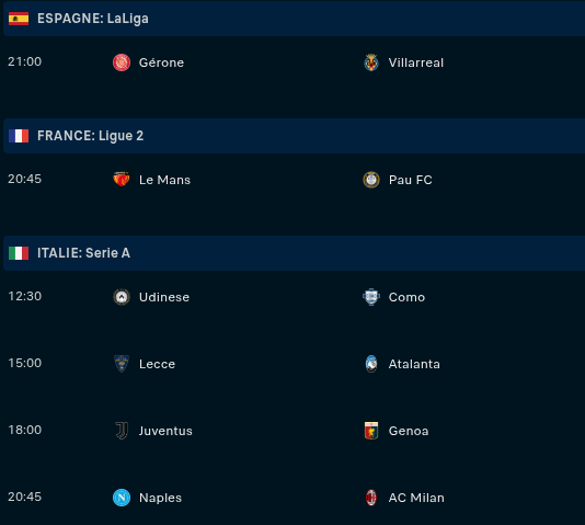 Dimanche : Angers - OL (15h) / Lorient - Paris FC (17h15) / Le Havre - Auxerre (17h15) / Metz - Nantes (17h15) / Monaco - OM (20h45) / Inter - AS Roma (20h45)