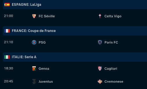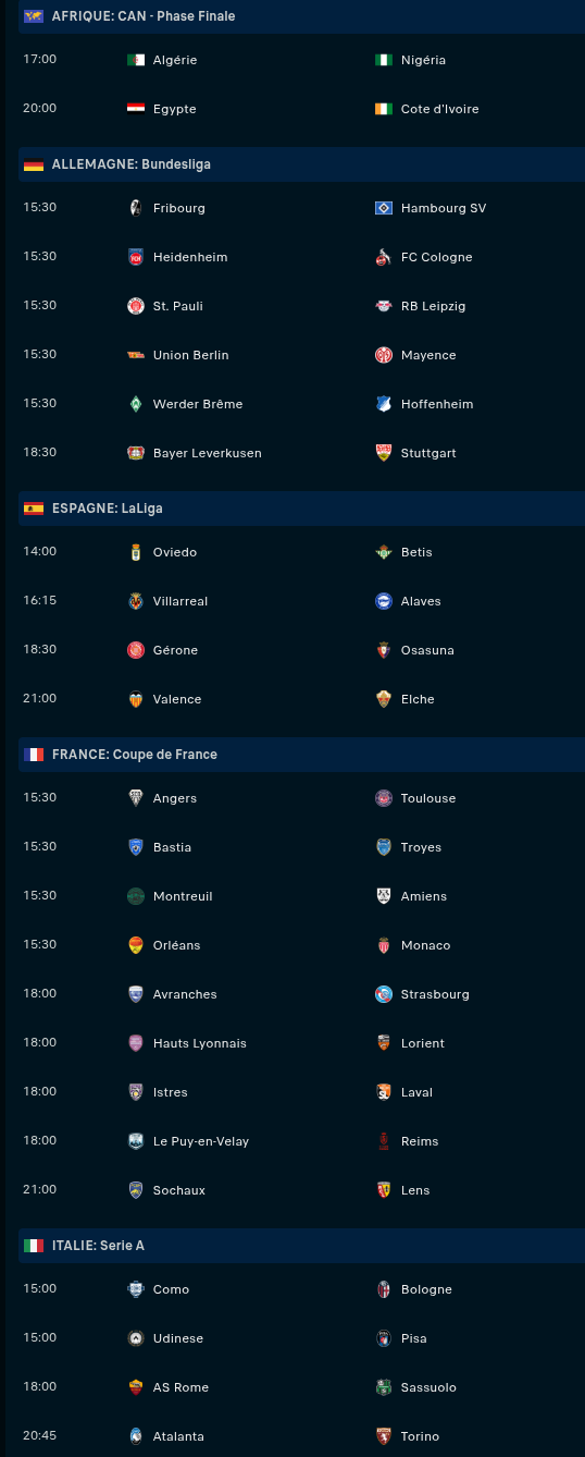 Samedi : Angers - Toulouse (15h30) / Orléans - Monaco (15h30) / Algérie - Nigeria (17h) / Avranches - Strasbourg (18h) / Égypte - Côte d’Ivoire (20h) / Sochaux - Lens (21h)