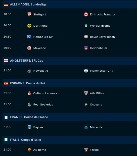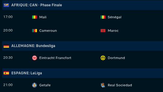 Mercredi : Mali ou Sénégal - Égypte ou Côte d’Ivoire (18h) / FC Cologne - Bayern (20h30) / Chelsea - Arsenal (21h) / Cameroun ou Maroc - Algérie ou Nigeria (21h)