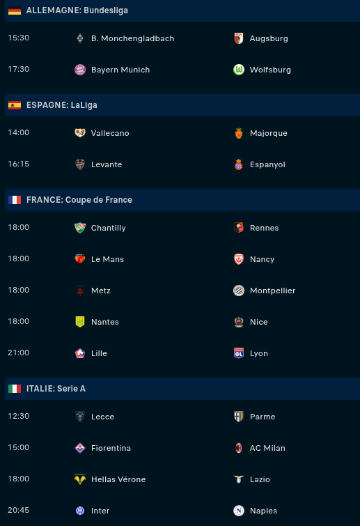 Dimanche : Bayern - Wolfsburg (17h30) / Man Utd - Brighton (17h30) / Nantes - Nice (18h) / Metz - Montpellier (18h) / Chantilly - Rennes (18h) / Inter - Napoli (20h45) / Lille - OL (21h)