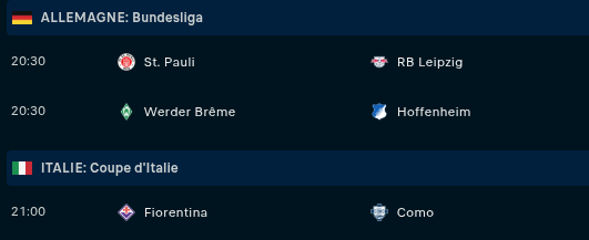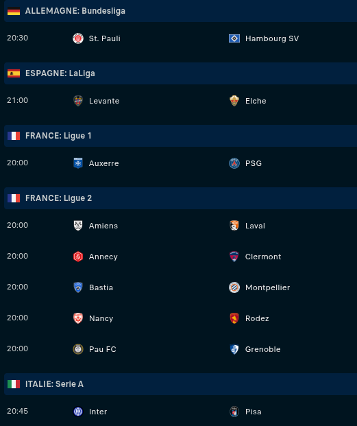 Dimanche : Nantes - Nice (15h) / C. Palace - Chelsea (15h) / Barça - Oviedo (16h15) / Metz - OL (17h15) / Brest - Toulouse (17h15) / Paris FC - Angers (17h15) / Arsenal - Man Utd (17h30) / Juventus - Napoli (18h) / Lille - Strasbourg (20h45) / AS Roma - AC Milan (20h45)