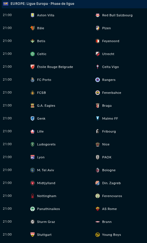 Jeudi : 21h00 ⋅ Mutliplex Ligue Europa ⋅ Lille - Fribourg / OL - PAOK / Ludogorets - Nice / Porto - Rangers / etc.