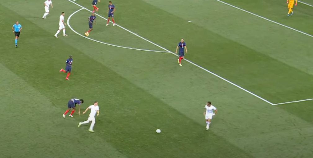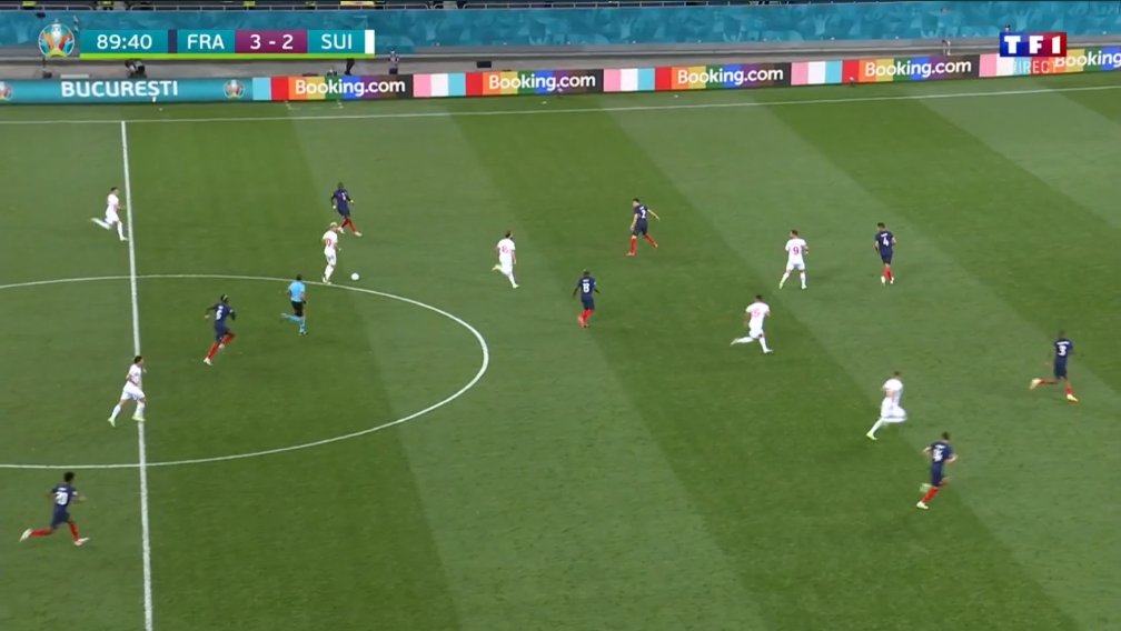 Rabiot couvre dans l’axe car Kimpembe se retrouve à terre sur le screen du milieu de l’action. Il ne peut pas sortir sur l’ailier Suisse sans ouvrir un trou énorme dans l’axe de la défense.