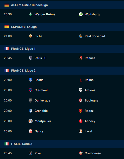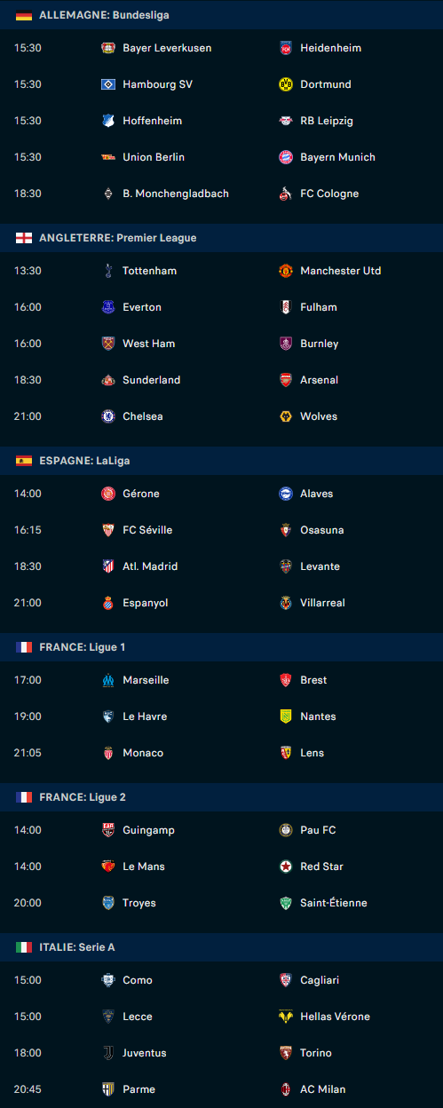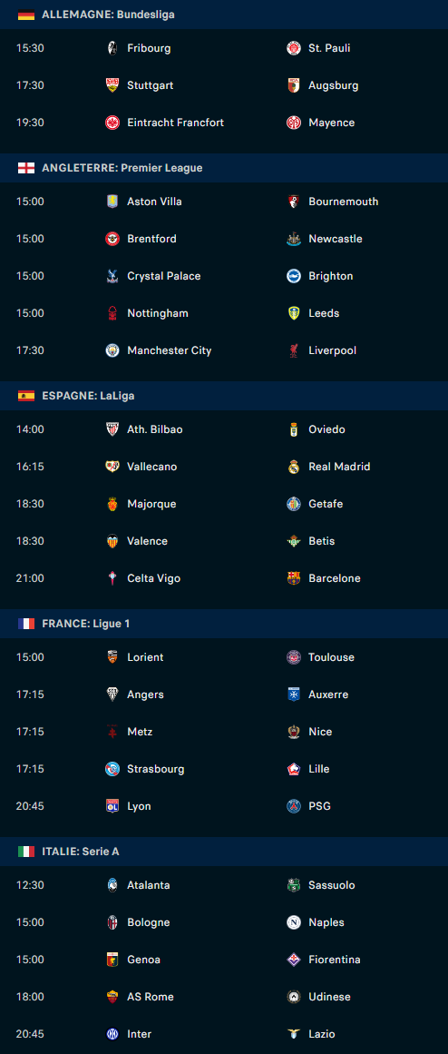 Dimanche : Lorient - Toulouse (15h) / Vallecano - R. Madrid (16h15) / Strasbourg - Lille (17h15) / Metz - Nice (17h15) / Angers - Auxerre (17h15) / Man City - Liverpool (17h30) / OL - PSG (20h45) / Inter - Lazio (20h45) / Celta Vigo - Barça (21h)