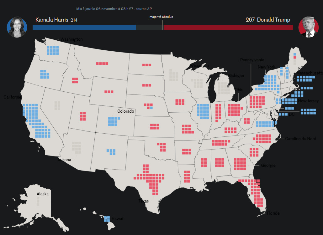 La derniĂšre MAJ (Pennsylvanie) qui enterre la majoritĂ© des maigres espoirs restants. Elle doit rafler tout le reste pour avoir une chance (Nevada, Arizona, Michigan, WIsconsin, le reste du Maine). Câest jouable (tous Ă©taient dĂ©mocrate la derniĂšre Ă©lection), mais ça se complique fort.