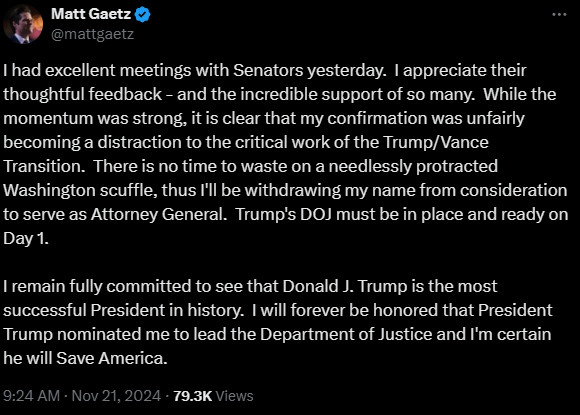 Gaetz se retire, les accusations crédibles de sexe avec une mineure ont eu raison de sa nomination en procureur général