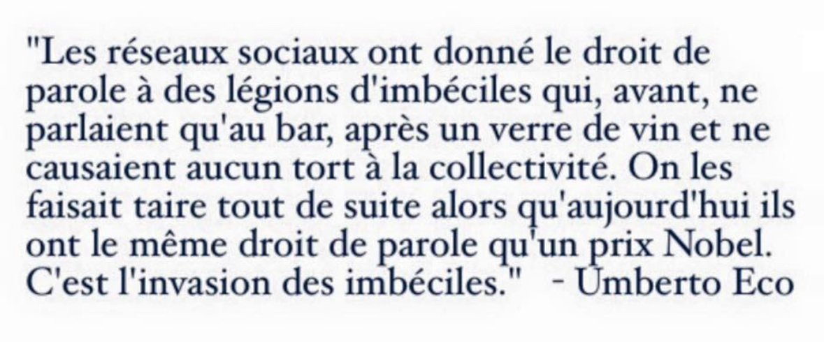 Tu as des abrutis qui se moussent entre eux sur de fausses citations (probablement faites par un bot dâailleurs, vu que ca reprĂ©sente presque 95% de la plateforme si on en croit les leaks). On a offert un PMU international aux imbĂ©ciles, ils sây font retourner le cerveau par des entitĂ©s partiales, et les gouvernements regardent ça sans prendre de vĂ©ritables mesures.
