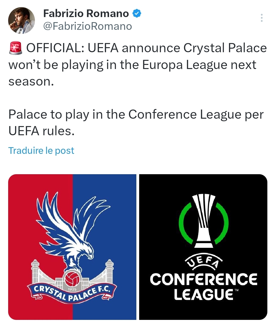 Crystal Palace pourrait ne pas jouer lâEuropa :