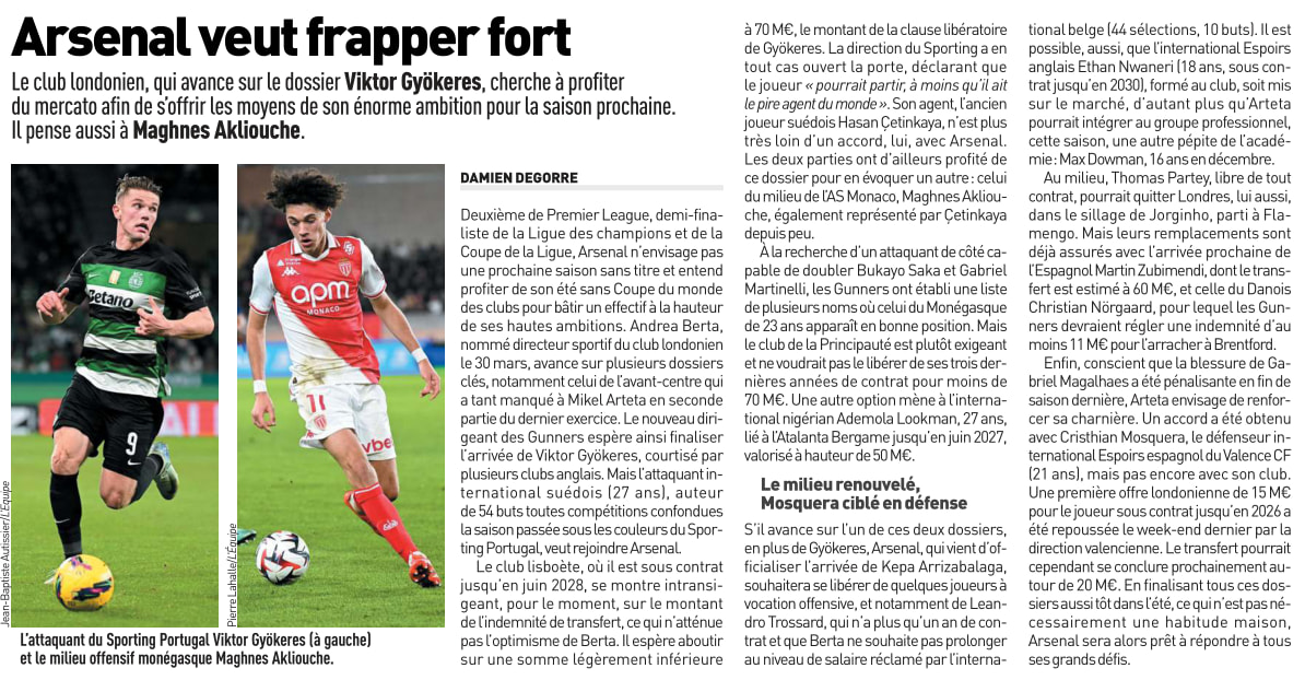 L’accord entre Arsenal et le Sporting pour Viktor Gyökeres est en cours de finalisation ce soir. Suite à la décision de l’agent de réduire sa rémunération de 10 %, Arsenal versera une indemnité initiale de 63,5 millions d’euros, plus 10 millions d’euros de primes supplémentaires en cours de finalisation. C’est parti, bientôt.