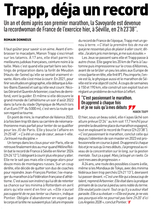 Recordwoman de France du marathon en 2h23ââ38 dimanche 23 fĂ©vrier, Manon Trapp a Ă©chouĂ© Ă 8 secondes des minima pour Tokyo de World Athletics (fĂ©dĂ©ration internationale dâathlĂ©tisme)⊠et Ă prĂšs de 2â30ââ de ceux de sa FĂ©dĂ©ration.