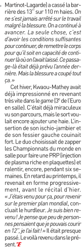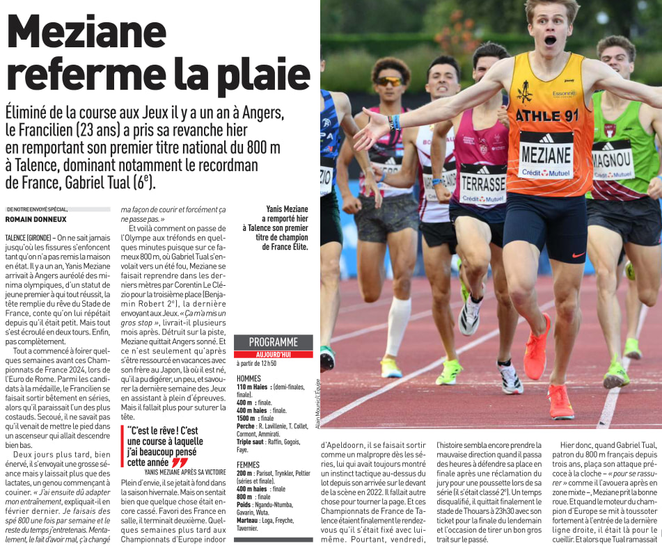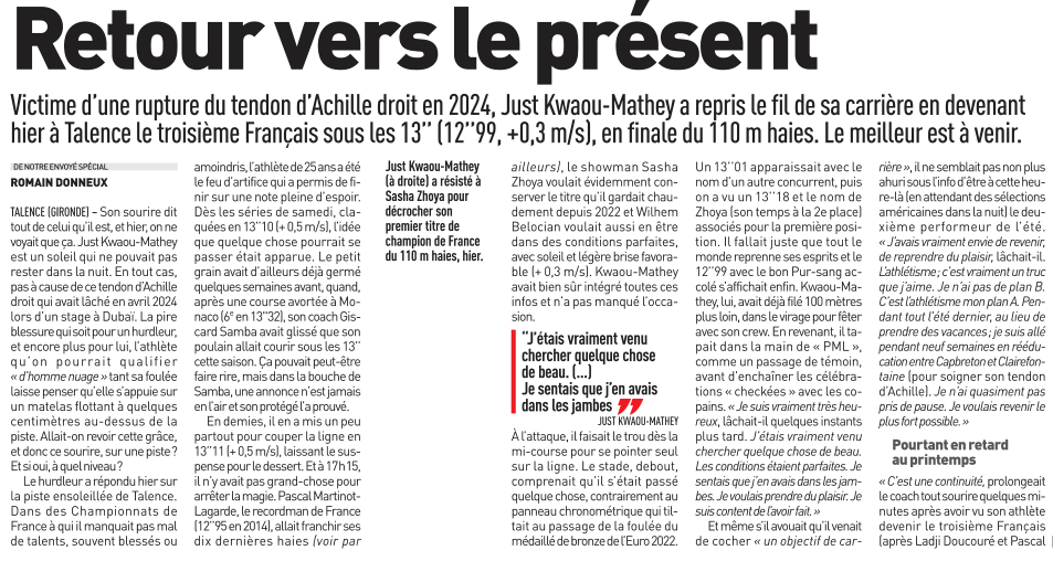 Quelques motifs dâespoirs quand mĂȘme pour lâathlĂ©tisme français ! Le 4x100 a surdominĂ© la course, Erius a pris lâor au 100m en 10.28, Erwan KonatĂ© a encore surdominĂ© le saut en longueur Ă©galement.