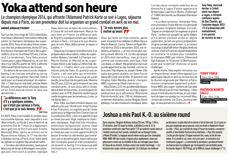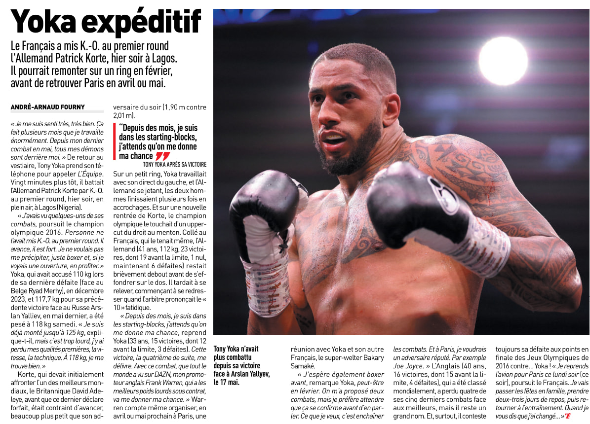 (@lâequipe) Victoire par K.-O. de Yoka ! Il nâa suffi que dâune petite minute et dâun uppercut bien placĂ© du champion olympique 2016 des super-lourds pour que Tony Yoka fasse la diffĂ©rence Ă Lagos. AprĂšs le compte de lâarbitre, Patrick Korte est restĂ© au sol, les yeux Ă peine ouverts.