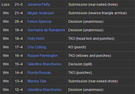 En regardant ça, sincĂšrement, il y a que Shevchenko - et Holm, un peu - qui fait flipper quelquâun comme elle. Et ce sont les deux combats les plus serrĂ©s (elle est pas loin dâen perdre un des deux dâailleurs, la dĂ©cision Ă©tait litigieuse lors du deuxiĂšme combat).