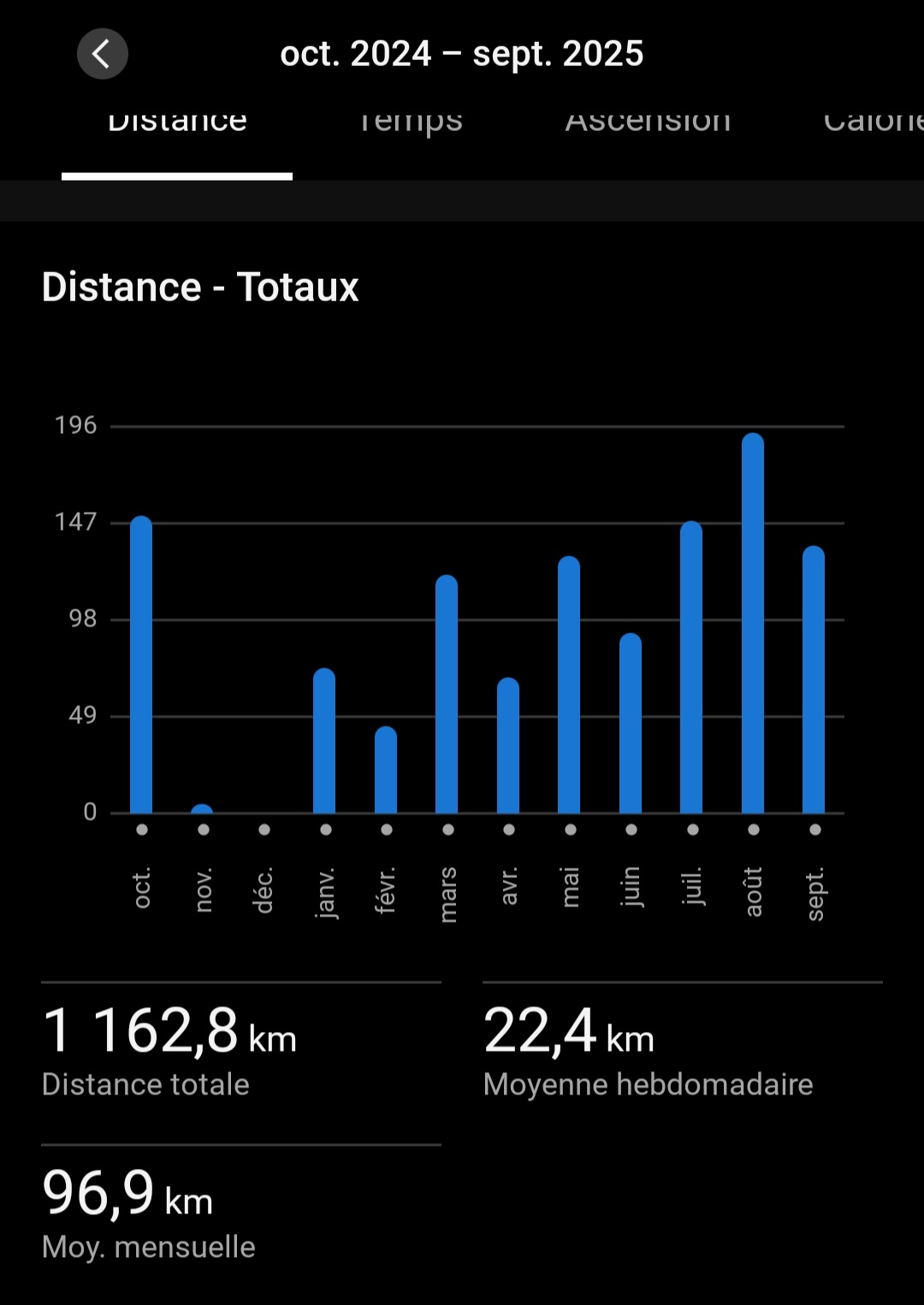 Retour de blessure en Octobre-Novembre et petit creux en Mars pour prĂ©parer la saison sur piste puis lâĂ©tĂ© pour la prĂ©pa semi marathon.