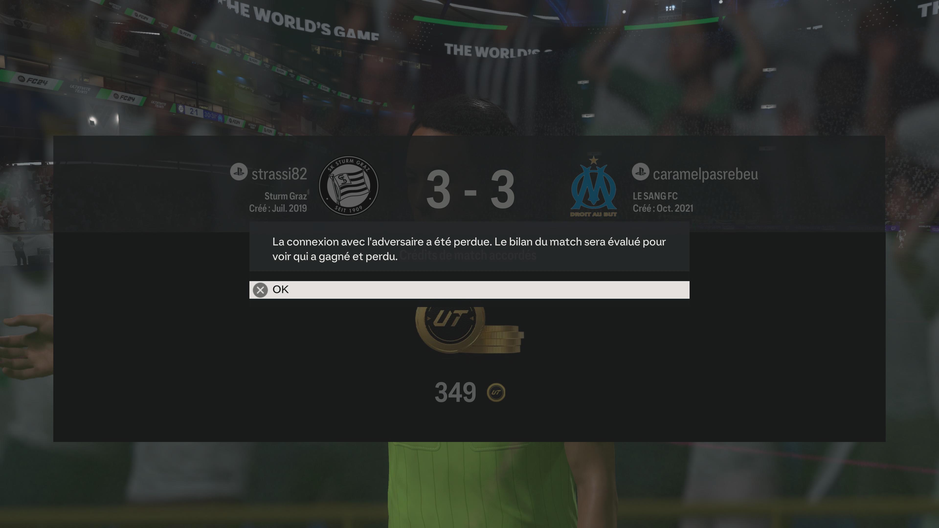 Deuxième match je gagne 5-2. Après la fin du match j’ai un message comme quoi je suis déco, défaite ![]()
