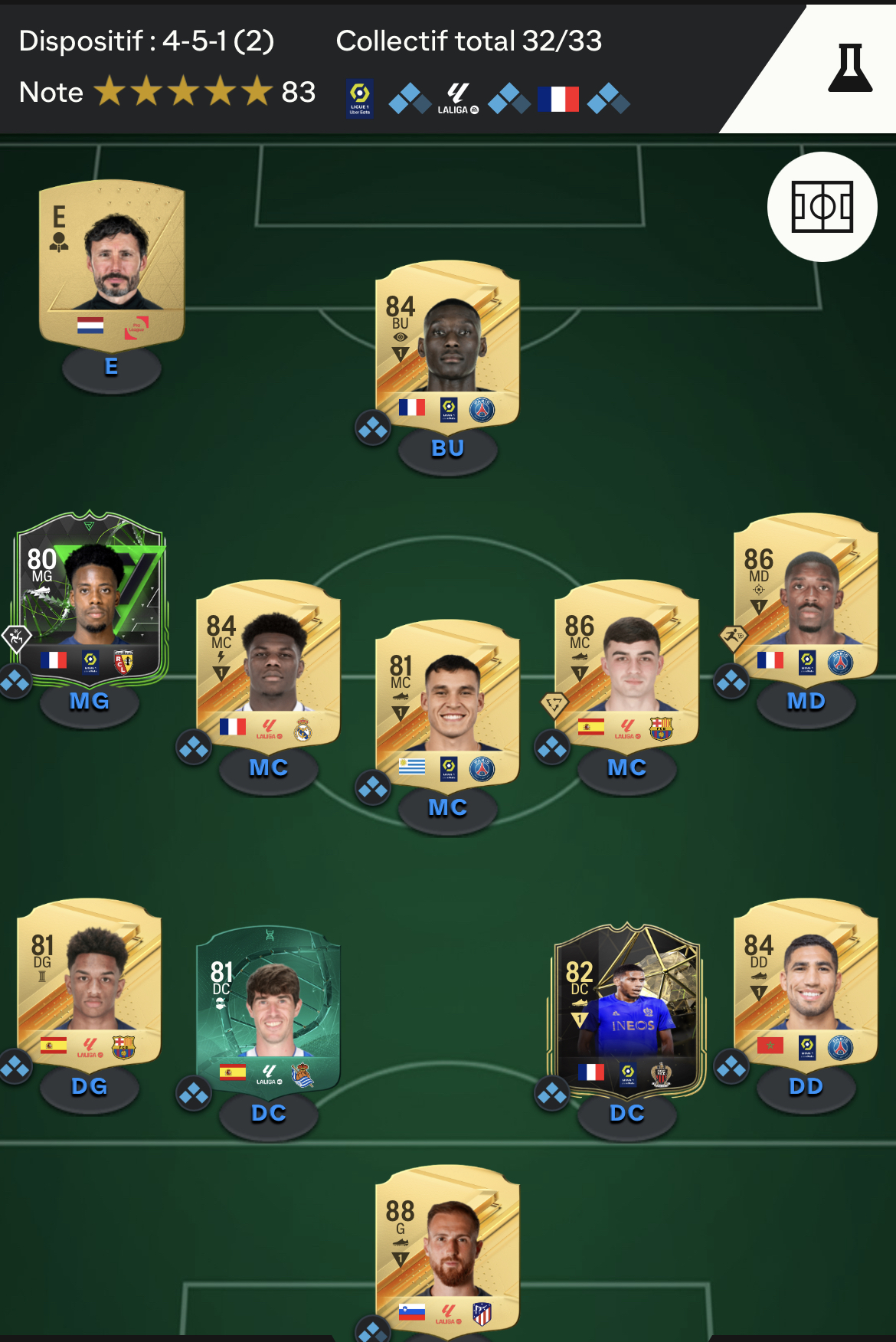 Ah et en balançant des doublons dans un +78 j’ai récup Hakimi, donc mon onze à un bel accent parisien ![]()