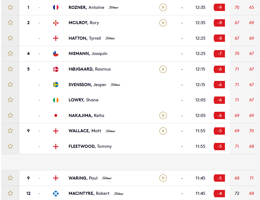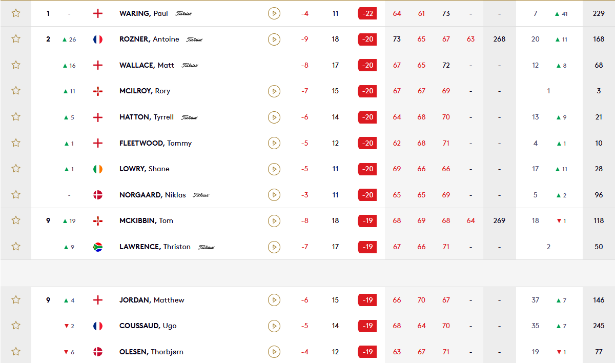 Fin de la 3eme journĂ©e et grĂące Ă un eagle au 18 Antoine Rozner est co-leader Ă -12 avec McIlroy et R. Hojgaard. Pour lâinstant, Rozner a gagnĂ© sa carte sur le PGA Ă demain pour la derniĂšre journĂ©e.