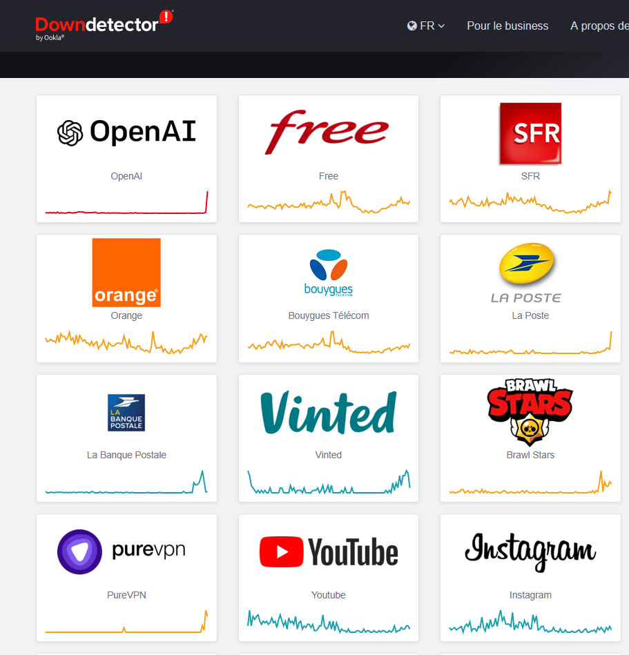 Downdetector surveille et analyse des signaux de ses propres sites Web, plateformes de réseaux sociaux et d’autres sources Web pour détecter automatiquement des incidents et des interruptions de services.