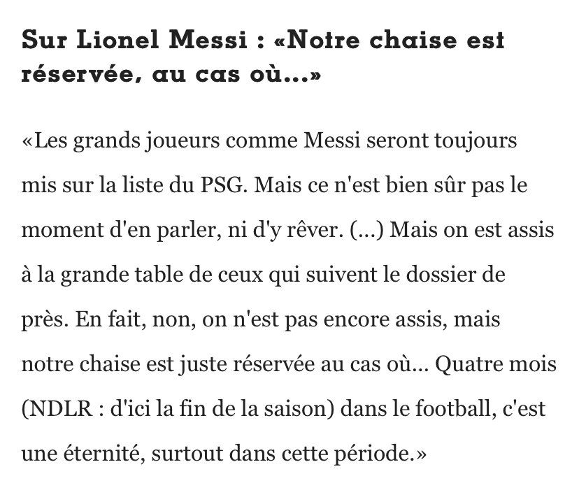 Il en parle Ă demi mot, câest plus de la langue de bois quâautre chose. Et ce sont des propos de FĂ©vrier, aux derniĂšres nouvelles Messi est libre de signer dans un autre club pour la saison prochaine depuis le 01/01/2021