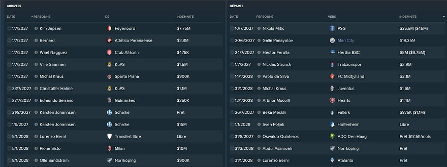 Ma stratégie de transfert se met en place, à savoir recruter un minimum de joueurs de plus de 20 ans et remplacer les départs par des joueurs formés au club ou préformé.