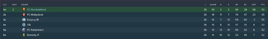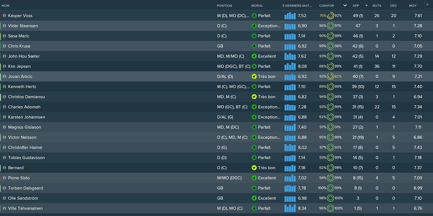 Peu de mouvement cette annĂ©e encore, je joue la carte de la stabilitĂ©. On notera le dĂ©part de Vasilev, meilleur buteur du club de la saison derniĂšre. Jâai pris de la dĂ©cision de le vendre Ă cause de sa tendance aux blessures et ses difficultĂ©s dans les gros matchs. Enfin, je voulais donner sa chance Ă Ferolla, buteur uruguayen recrutĂ© il y a 3 ans et qui revient dâun prĂȘt satisfaisant Ă Mouscron.