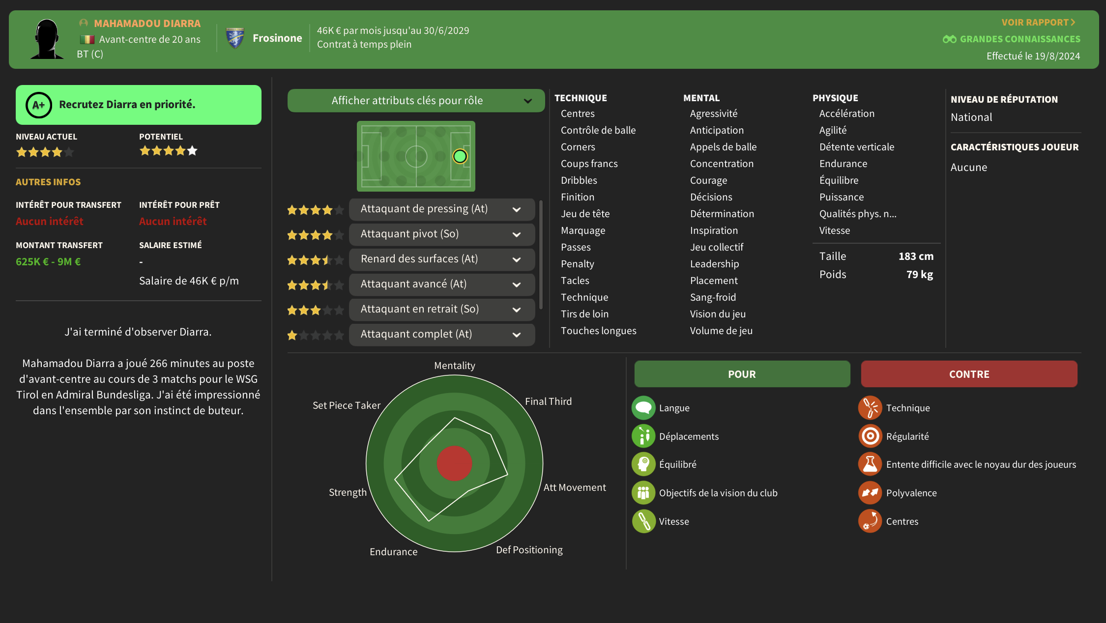 Quel kiff de recevoir mes rapports comme ça. Là c’est avant le début de saison, mais dans le rapport détaillé on a les trucs sur les stats qui s’ajoutent. (genre : 15ème meilleur tacleur du championnat)