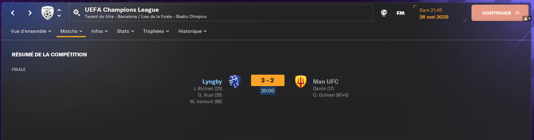 Tout ça pour dire que la Ligue des Champions a été gagnée. Bien plus tôt que je ne m’y attendais mais l’équipe était fantastique à mon arrivée et les deux renforts engagés ont apportés beaucoup. La partie est terminée et je ne sais pas si je vais continuer un peu où me lancer dans un autre challenge !