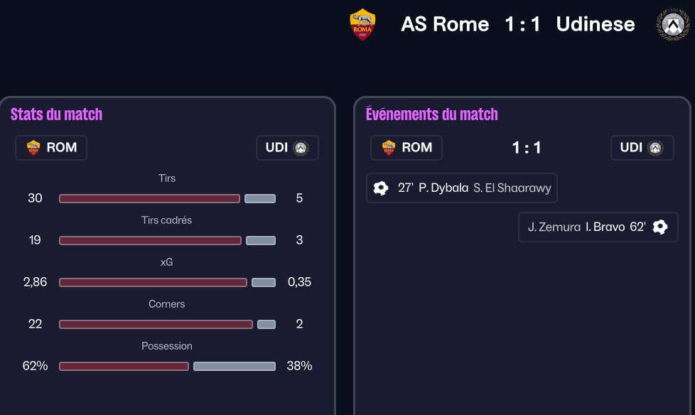 En gros ma partie à MU me soule, ça joue super bien mais je gagne pas ou peu comme mis la haut, marre des gardiens adverses HDM alors que mes joueurs ont le moral haut, et que tout va bien. Donc j’ai commencé une partie avec la Roma pour test, en simulant tous les matchs, et je gagne tout. Mais c’est frustrant, je veux vivre le match moi :/
