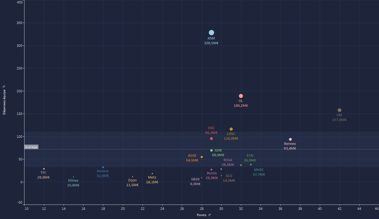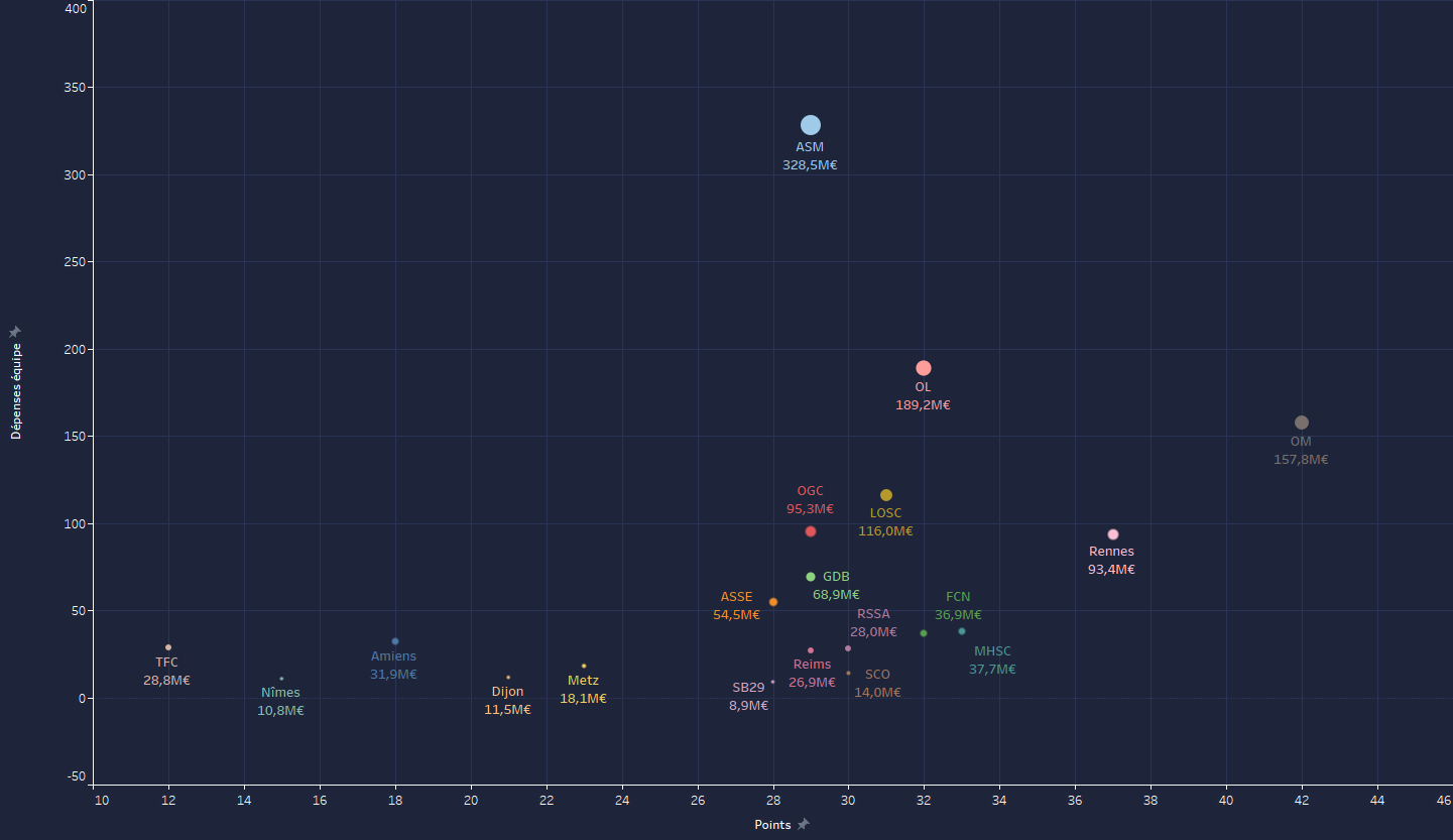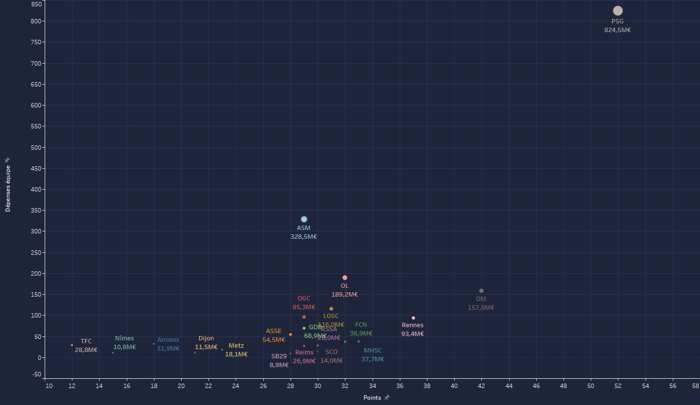 Graphique des dĂ©penses pour acheter les joueurs de lâĂ©quipe actuelle en comparaison du nombre de point pour cette annĂ©e. (Jâai vu un graphâ similaire sur r/soccer pour la PL)