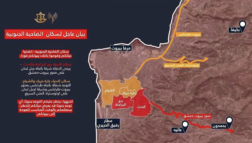 Ăa ordonne lâĂ©vacuation totale de toute la banlieue sud de Bayrouth vers le nord. Plus de 400000 personnes. Lâordure de Bezalel Smotrich, ministre de la DĂ©fense, a mĂȘme annoncĂ© que le sud du Liban allait trĂšs bientĂŽt ressembler Ă Khan Younis.
