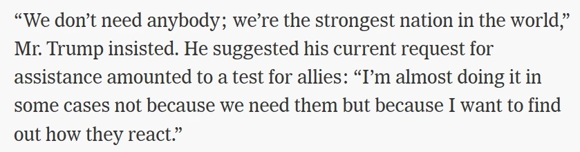 Pas mal dâarticles sortent, sur le fait que Netanyahu a manipulĂ© Lindsey Graham puis Trump pour entrer en guerre et leur a cachĂ© lâescalade (la scĂšne du pĂ©trole brĂ»lant autour des villes), sur les bateaux spĂ©cialisĂ©s dans la dĂ©tection/destruction des mines navales qui ont Ă©tĂ© rappelĂ©s juste avant la guerre et le fait que ça les bloque totalement Ă prĂ©sent.