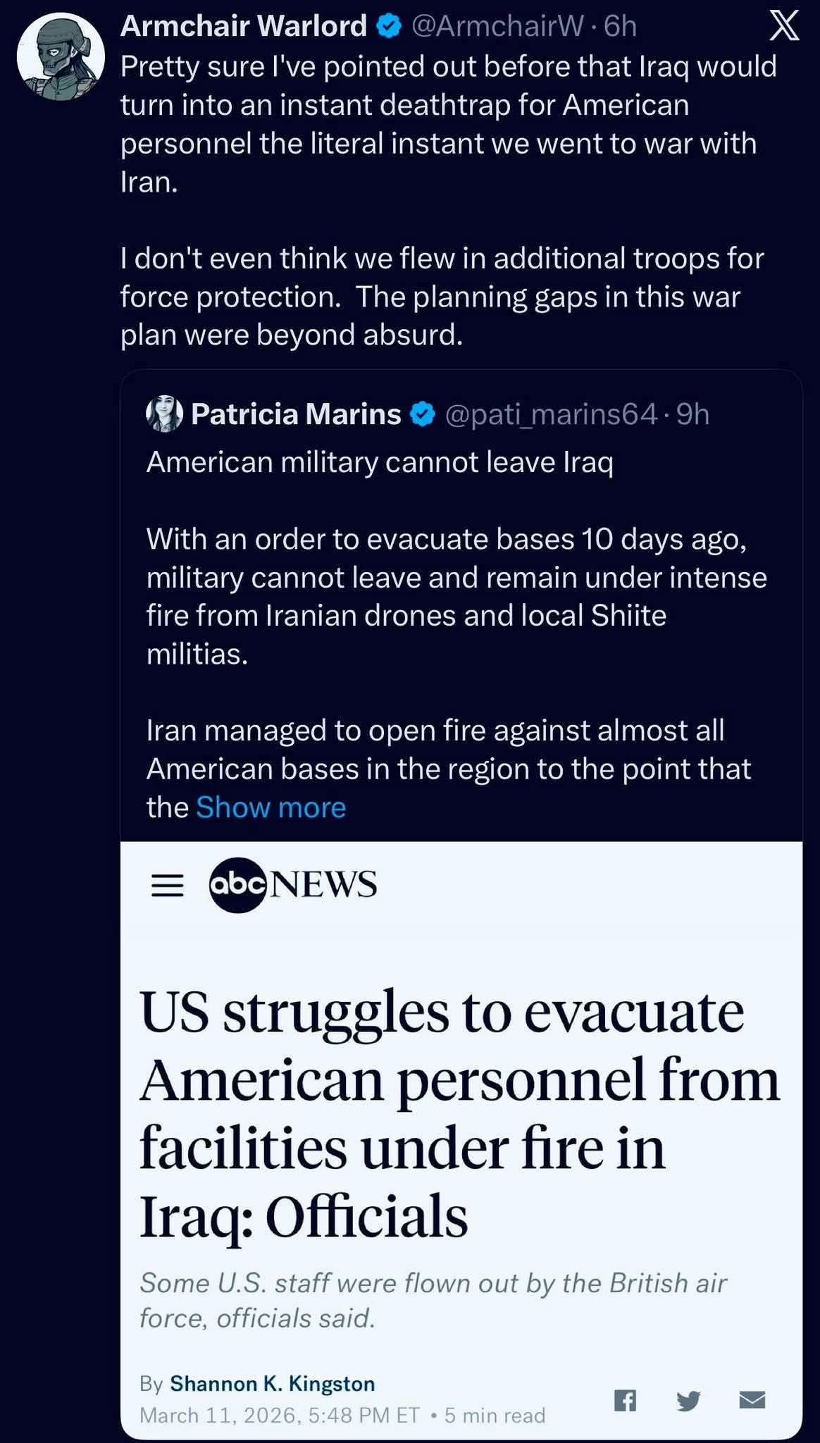 On dirait de plus en plus quâon a glissĂ© Ă lâoreille (Netanyahu?) de Trump que quelques assassinats ciblĂ©s suffiraient. Parceque dĂ©clarer une guerre en Iran sans prĂ©voir les Ă©vacuations des bases amĂ©ricaines de la rĂ©gion, demander Ă la CorĂ©e des navires militaires, ca ne peut las sâexpliquer autrement que par une non prĂ©paration