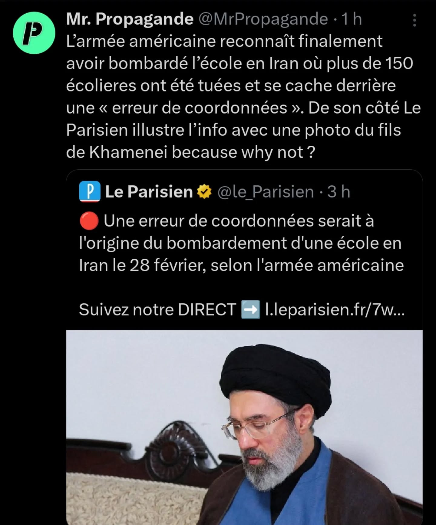 Le traitement par les mĂ©dias français est tout bonnement catastrophique. Jâai pris lâhabitude de lire pas mal de presse Anglaise, si je mâarrĂȘtais quâĂ la presse Française jâai lâimpression que jâaurais 9 articles sur les frappes iraniennes et 1 article sur les frappes amĂ©ricaines (avec tous les guillemets et tournures de phrase qui sâimposent pour ces cas bien Ă©videmment).