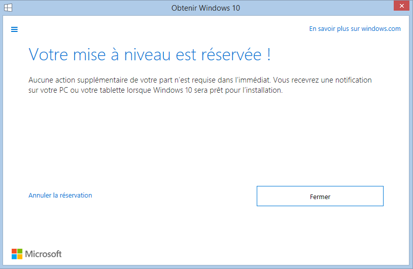 Je viens de retrouver une connexion internet sur mon PC ce qui n’était pas arrivé depuis 1 mois. J’avais réservé W10 y a plusieurs semaines (j’ai 8.1 et le carré en bas à droite) mais impossible de le télécharger. Ils me disent en statut que la MAJ et bien réservée mais me propose pas de le télécharger …