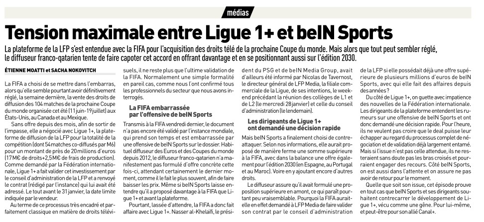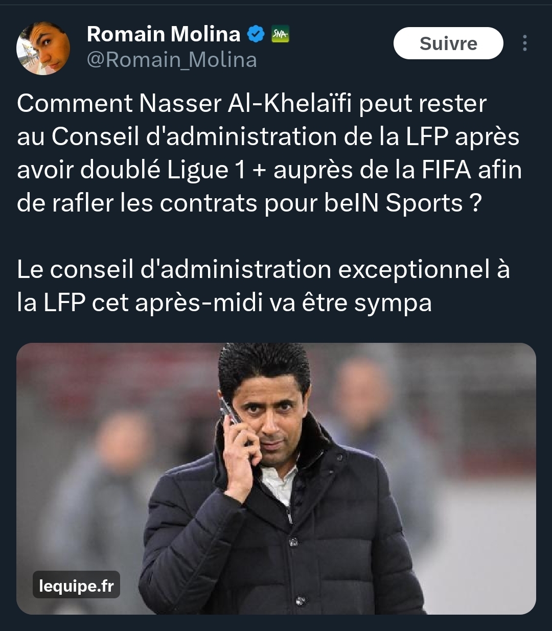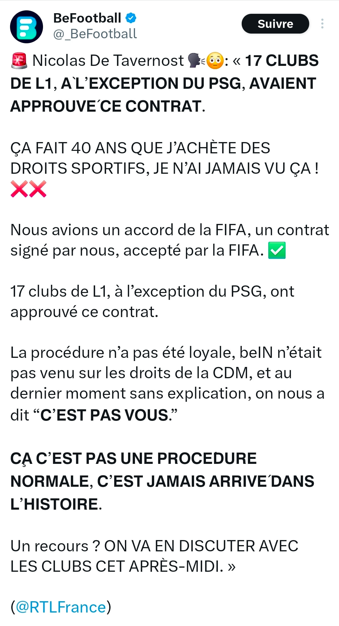 en gros ce quâil se dit câest que de Tavernost a nĂ©go et validĂ©. Il a proposĂ© au CA des clubs. Tous les clubs de L1 Ă©taient ok sauf PSG. Et derriĂšre Nasser a contactĂ© le gars chez Bein lĂ , Obaidi pour faire une contre propal pour bein en prenant 2026/2030 pour forcer la main de la FIFA ![]()