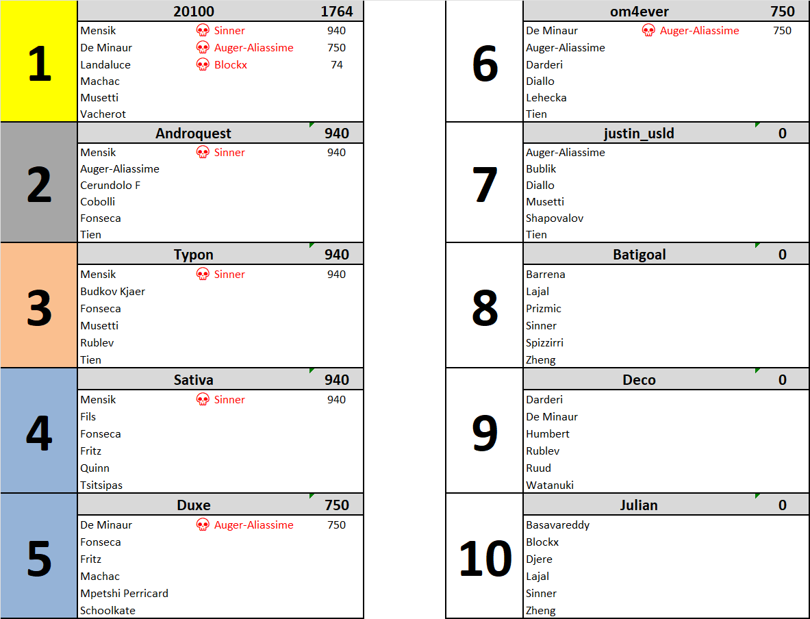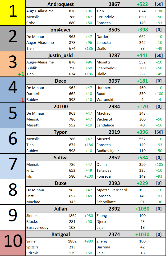 @Androquest creuse un petit peu plus lâĂ©cart mais @om4ever et @justin_usld tiennent un bon rythme, ce dernier monte sur le podium au profit de @Duxe trĂšs peu performant cette quinzaine. Statut quo globalement malgrĂ© que ce soit un M1000. @Julian et @BaTiGoL remontent un peu au classement avec la victoire de Sinner mais restent encore loin de la tĂȘte.