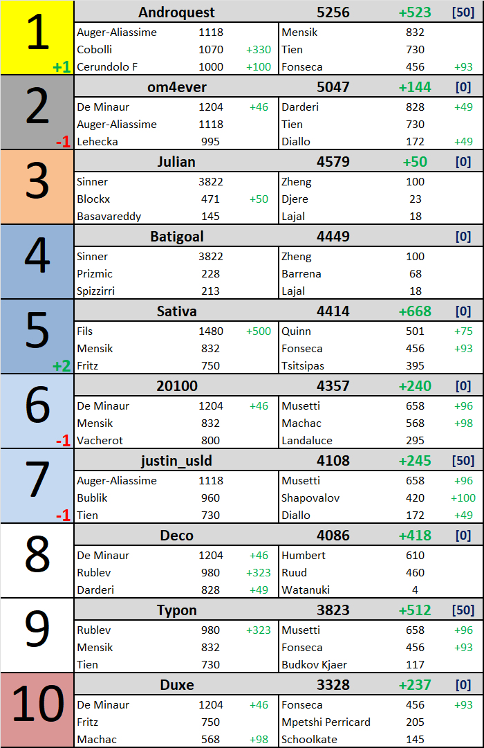 @Androquest reprend la tĂȘte du classement Ă @om4ever derriĂšre la bonne performance de Cobolli Ă Munich. Pas de changement derriĂšre en dehors de @Sativa qui recolle sur le podium grĂące Ă Arthur Fils.