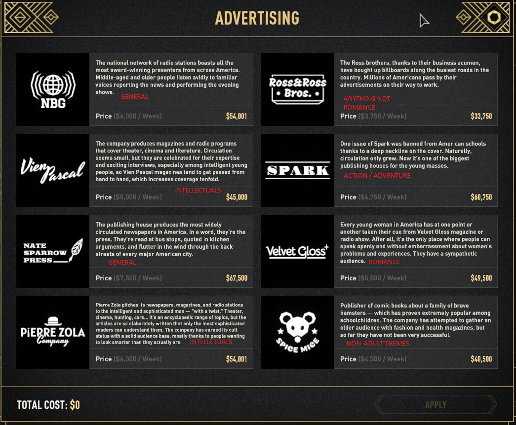 Ici, on peut placer les bĂątiments mais câest vraiment secondaire. Ici on gĂšre plus le personnel, il faut attribuer la bonne idĂ©e de scĂ©nario (ou le crĂ©er selon quelques critĂšres) au bon scenariste, puis attribuer les acteurs aux profils de personnages du script, ensuite on y met un producteur, rĂ©al, etc. Je pense que câest moins dĂ©taillĂ© sur des points, sur la micro gestion des acteurs, des scripts et des films, mais plus riche sur lâorganisation des films, lâagenda.