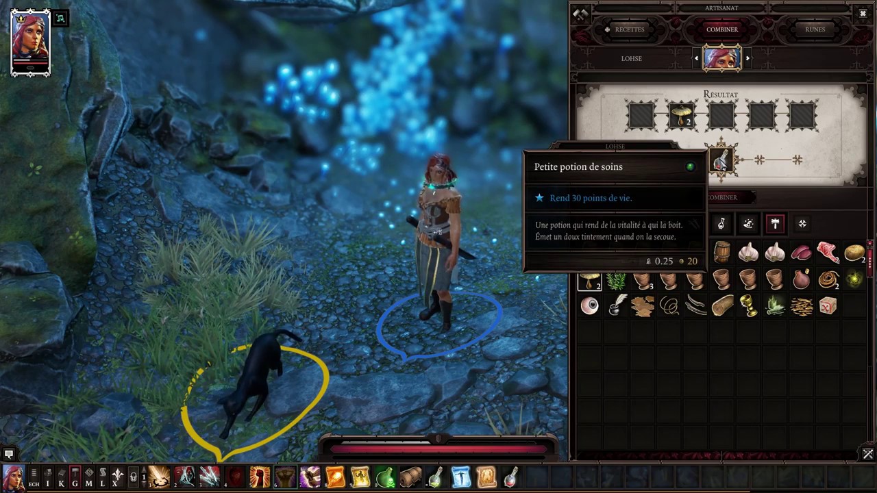 - Entouré de bleu, cette boite sert à placer les ingrédients à combiner. C’est ici que vous allez placer une bouteille vide et un cèpe pour faire une petite potion de soins.