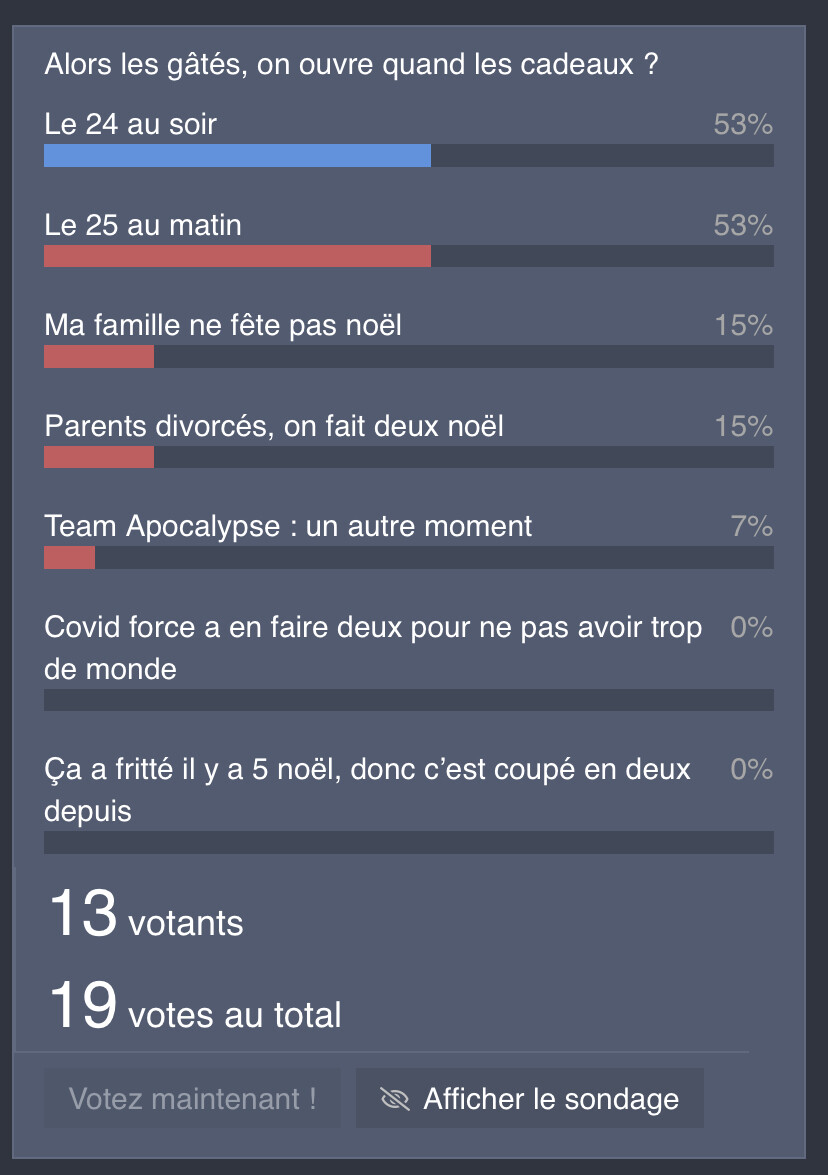 Perso en tant que pĂšre NoĂ«l jâai beaucoup plus de demandes pour le 24 au soir que le 25 au rĂ©veil.
