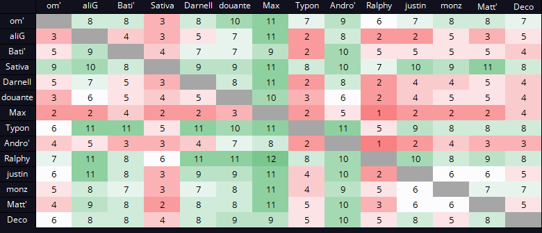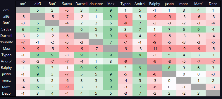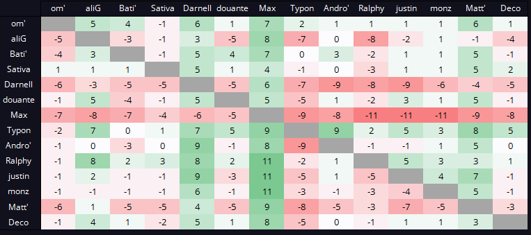 Tout le monde contre tout le monde. Dif correspond Ă la somme des diffĂ©rentiels (par exemple -2 + 1 = -1 de difâ)