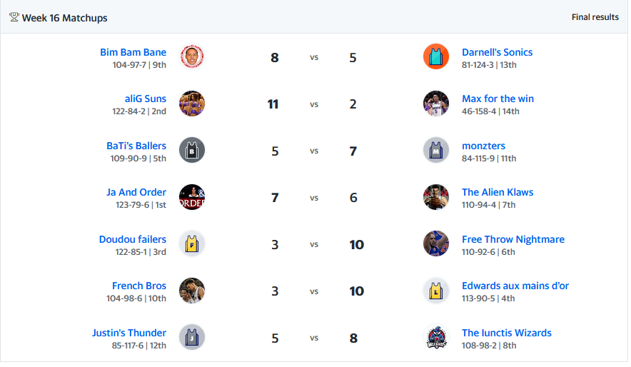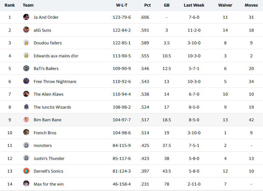 | BaTiâs Ballers | 2 | 77 | 66 | 4 |