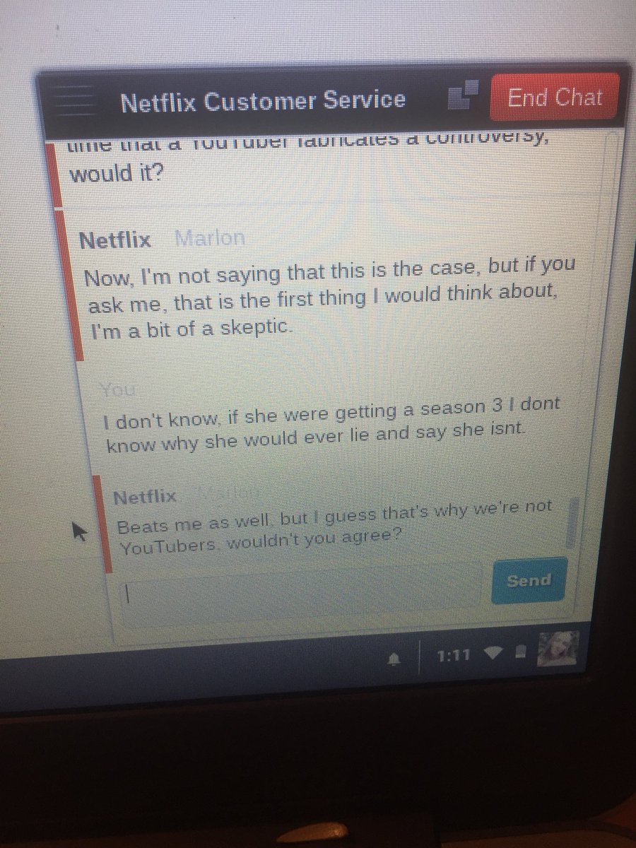 Ils annulent Haters Back Off! (série assez sous-estimée), mais se refuse à l’annoncer et un mec du support trash même l’actrice principale du fait de son passé sur Youtube (c’est ce pourquoi Netflix lui a donné une série)