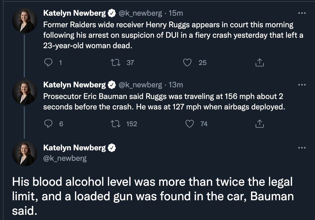 Ruggs se bourre la gueule et tue une femme et son chien en conduisant.