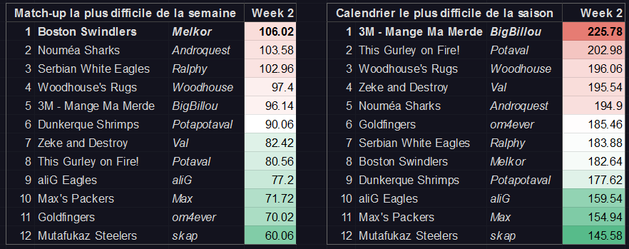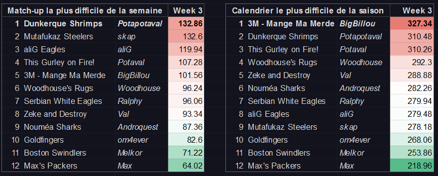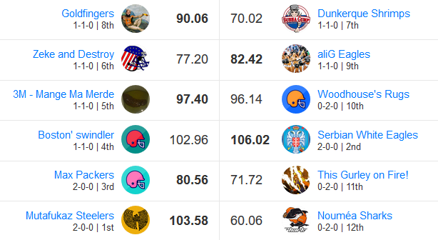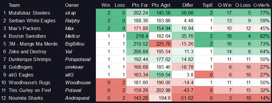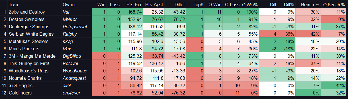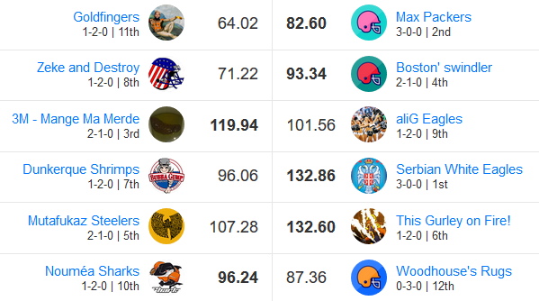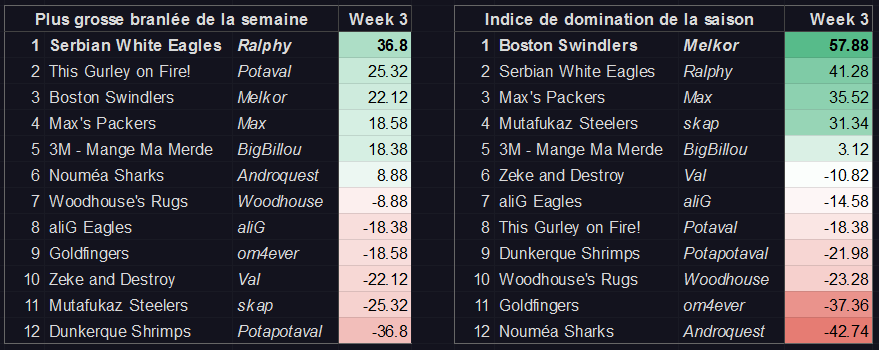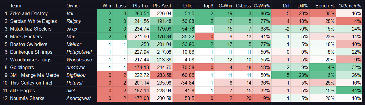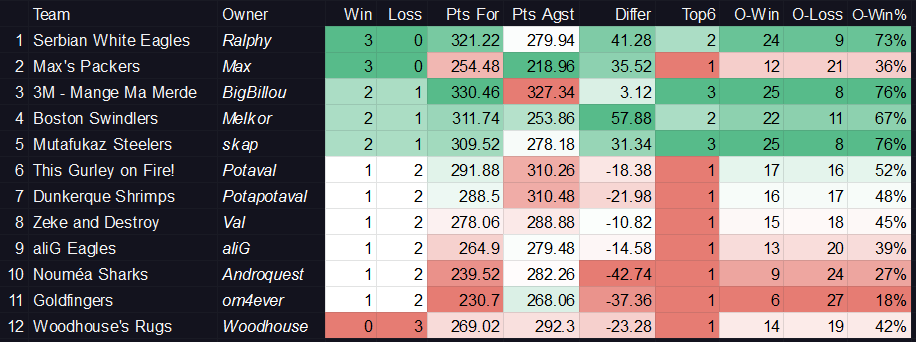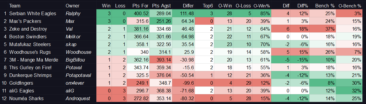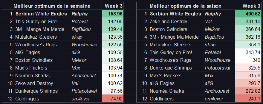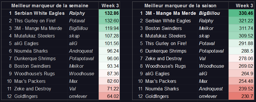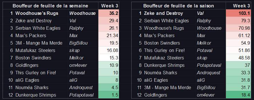 Prix du bouffeur de feuille de la semaine : Pas mal de grosses perf de receveurs sur le banc (Jackson, Watkins, Brown…), mais pas de victoire en optimum. En volume, c’est @Val qui a laissé le plus de points (39) en proportion c’est @Ralphy (42%)