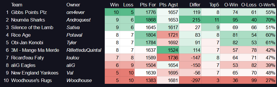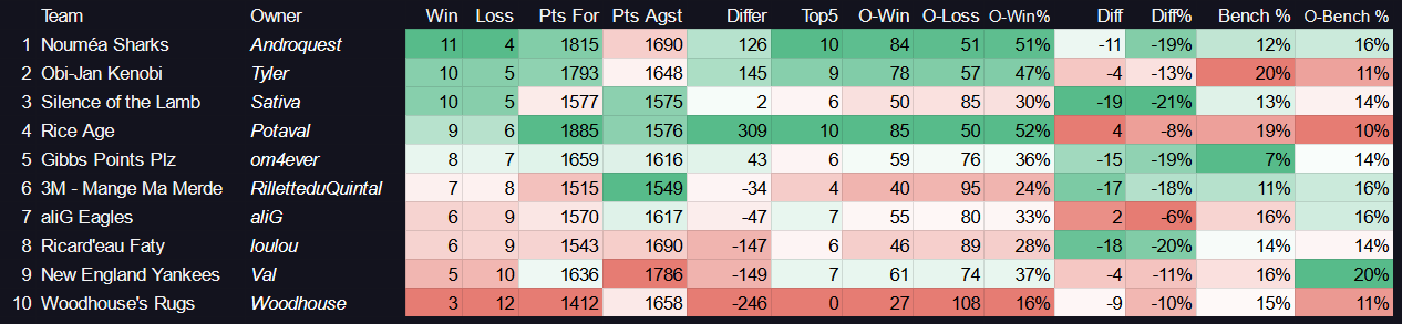 O-Win% : Pourcentage de victoire contre lâensemble des autres Ă©quipes